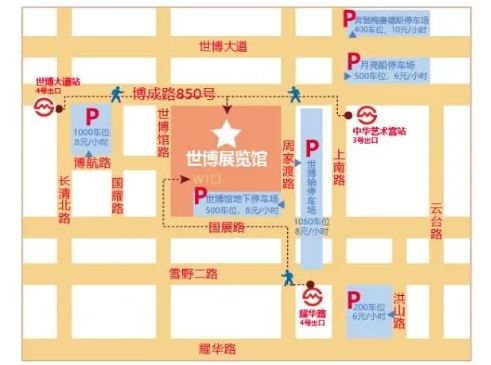 世博展览馆提倡绿色出行,欢迎公众乘坐公共交通前来参加活动。如自驾开车前来,停车场见上图P区域